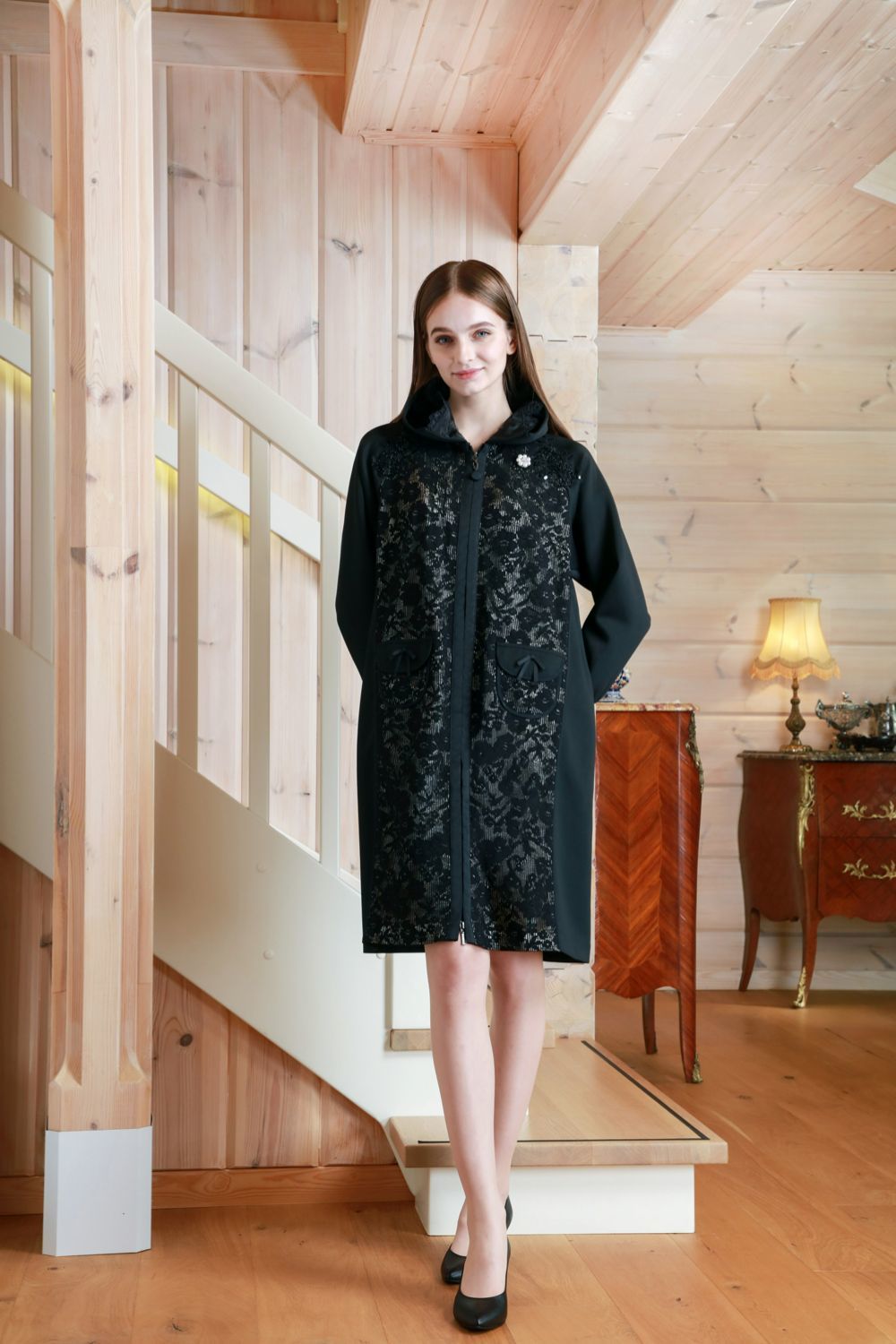 スタンドフリル透かしレース素材ダンボールニット素材コート 詳細 ▶