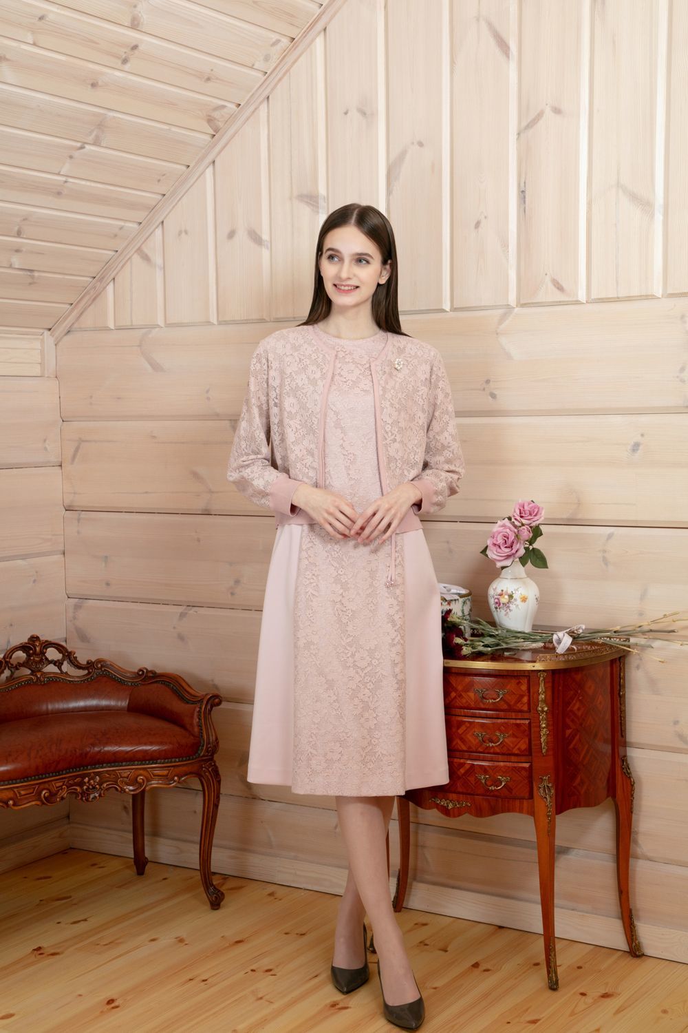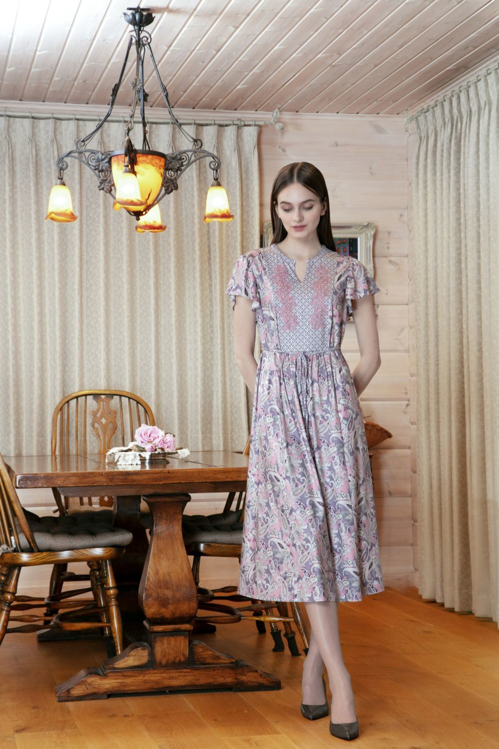 胸元レース×スリット入り ペイズリー柄切替ワンピース 詳細 ▶