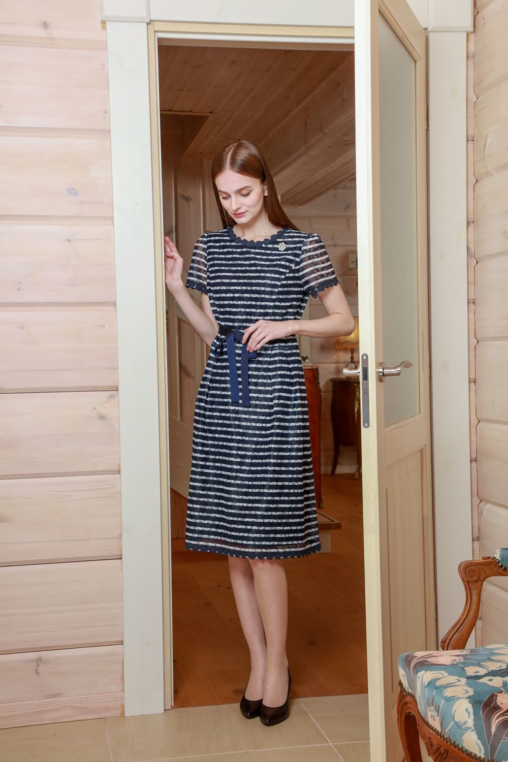 ボーダープリントレース素材 半袖ワンピース 詳細 ▶