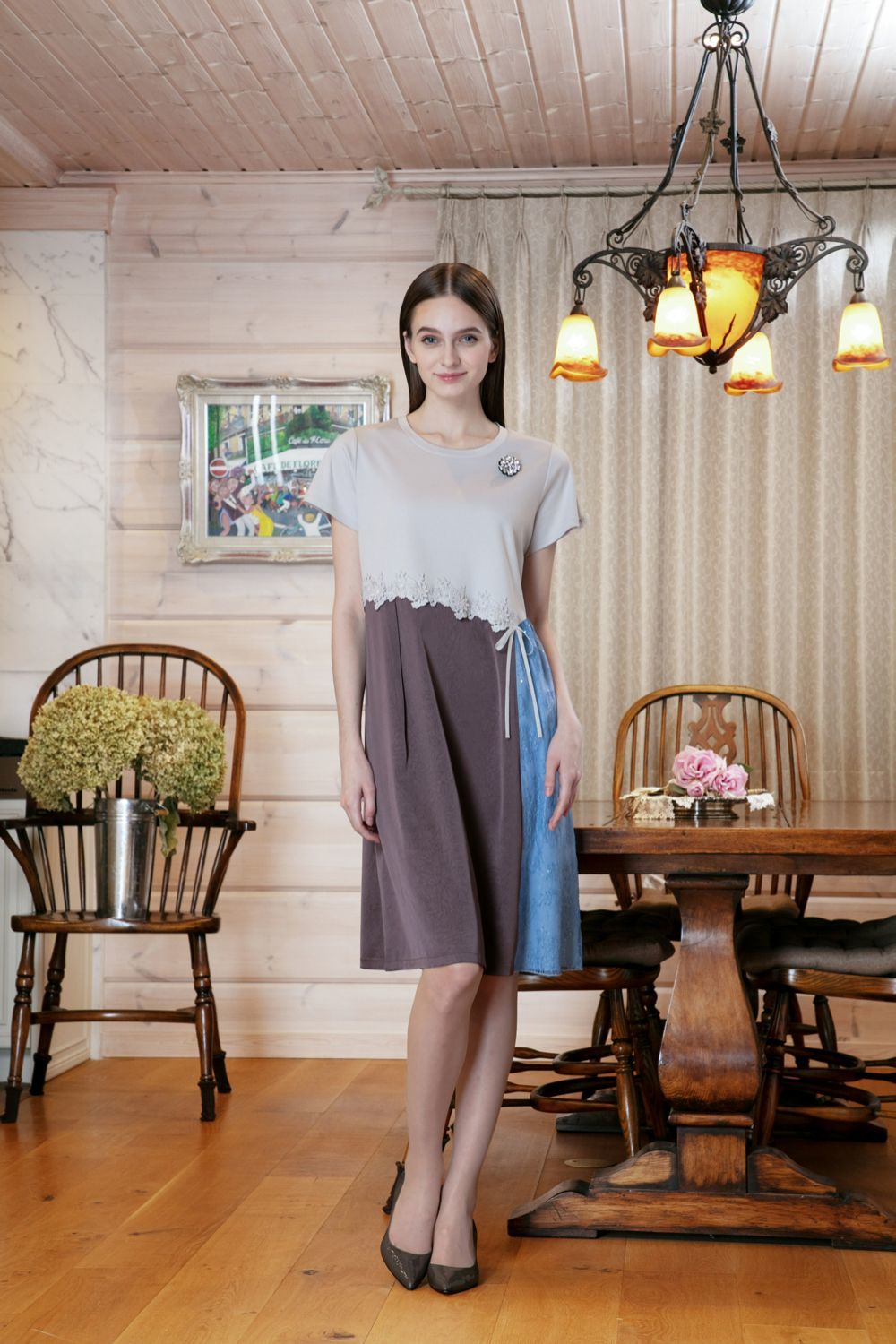 異素材配色アシンメトリー切替ワンピース 詳細 ▶