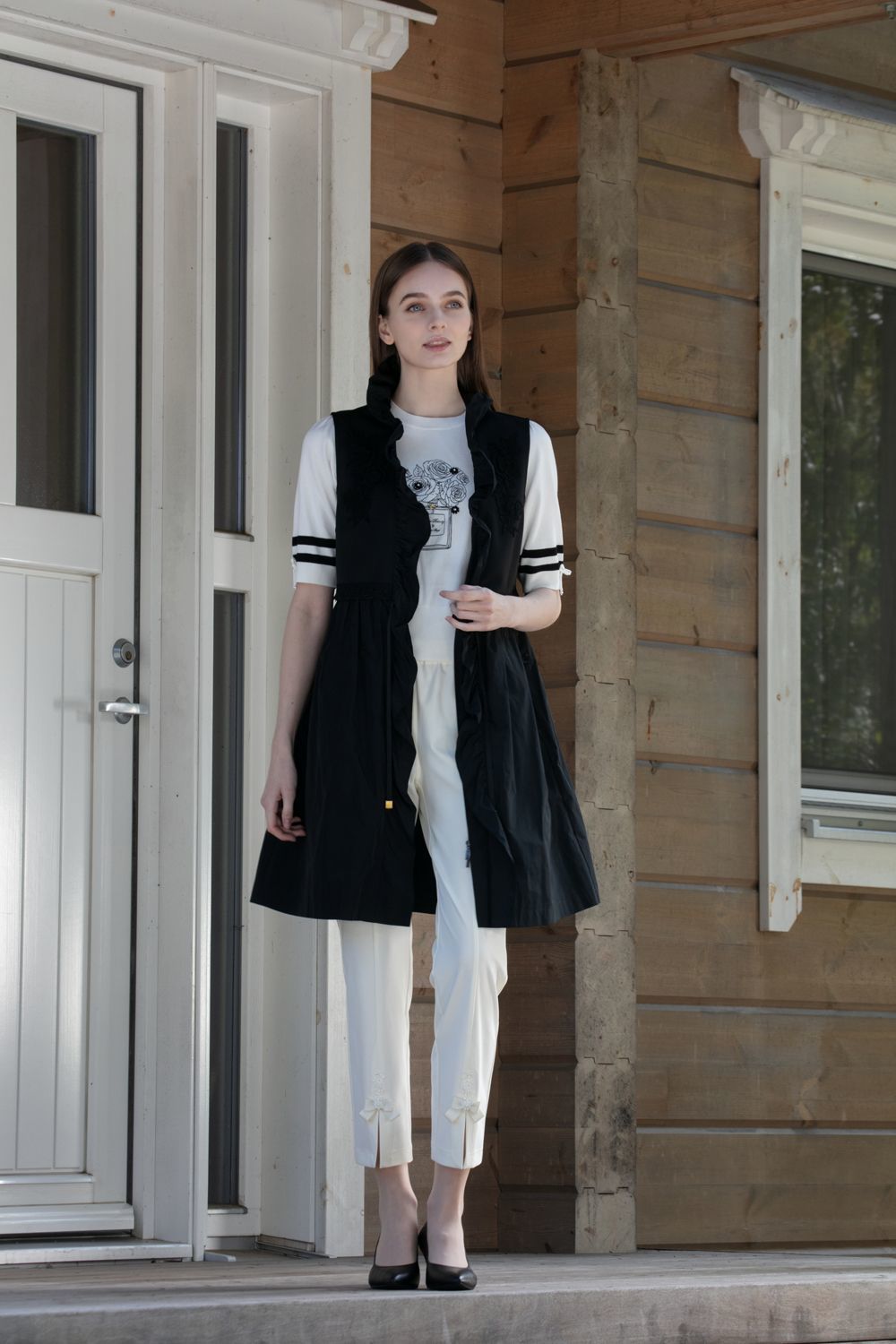 スタンドフリル透かしレース素材ダンボールニット素材コート 詳細 ▶