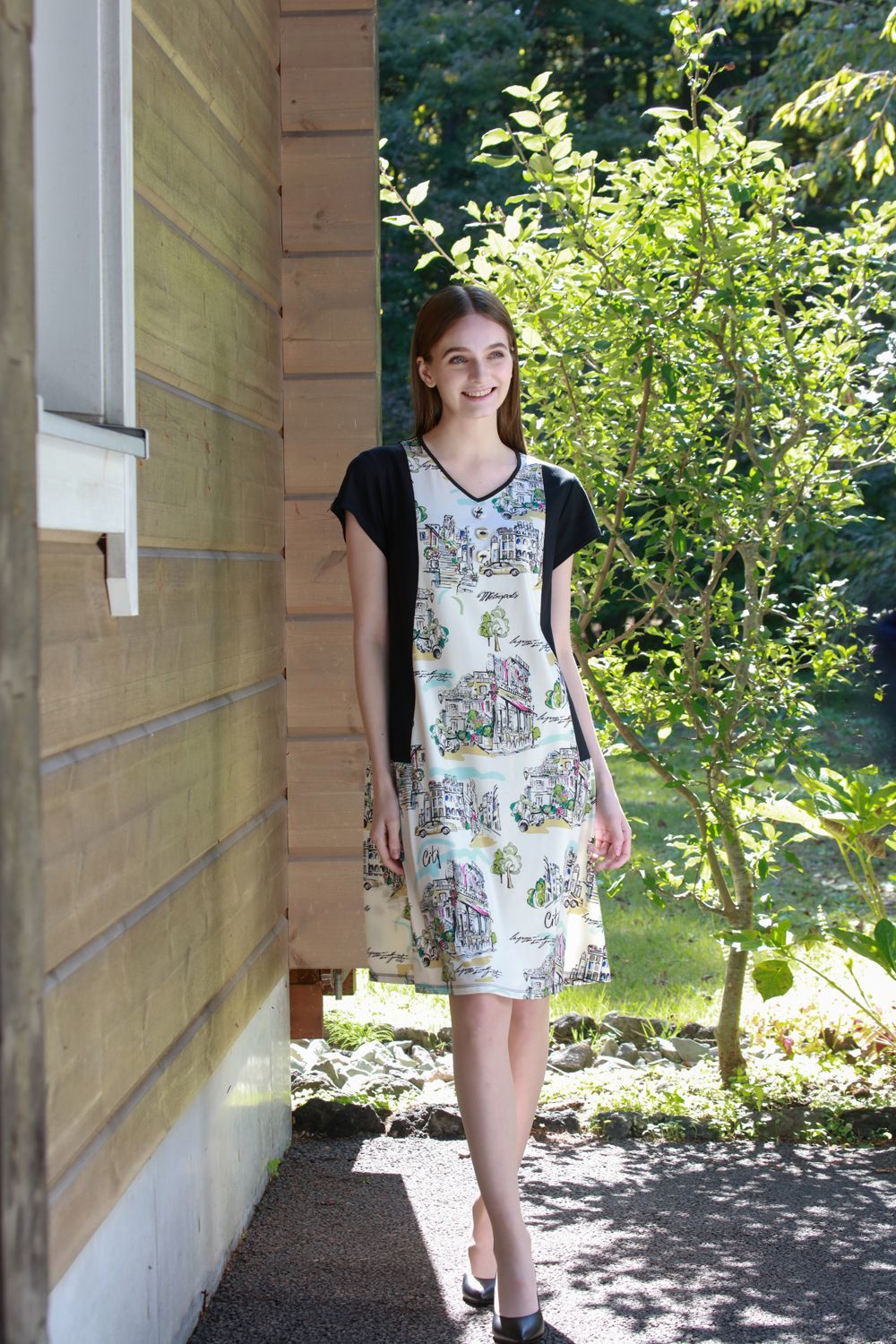 街並み風景プリントVネック 半袖ワンピース 詳細 ▶