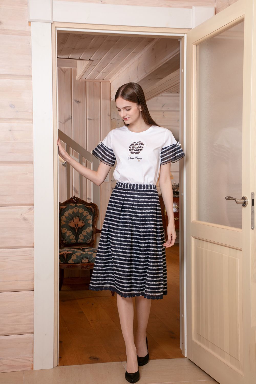 ストライプ柄×花フロッキープリント 半袖ワンピース 詳細 ▶