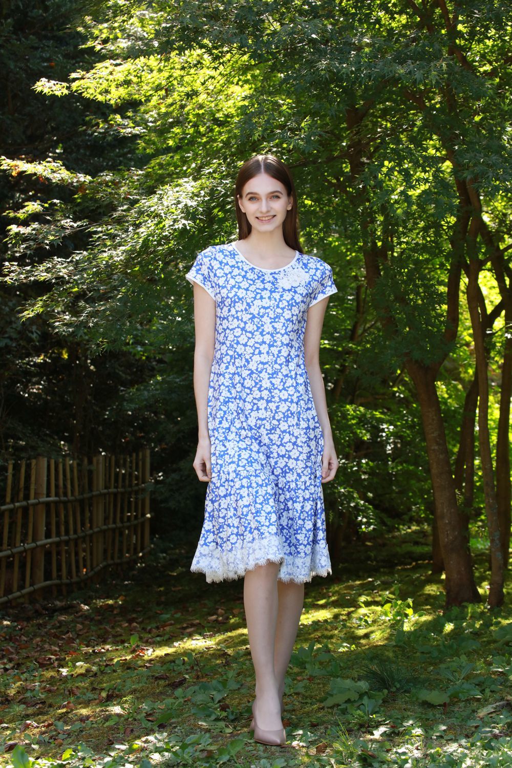 ブルー系フラワープリント 裾レース使いワンピース 詳細 ▶